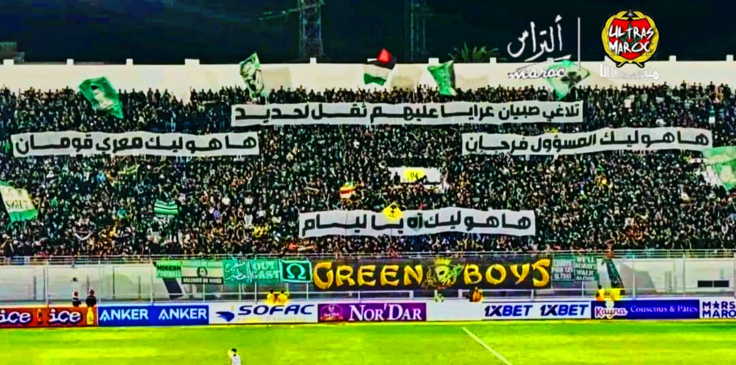 ورفع جمهور الرجاء رسالته في مباراة ناديه ضد نادي “سامارتكس الغاني”، التي جرت السبت 21 شتنبر على أرضية ملعب العربي الزاولي بالدار البيضاء، في إياب الدور التمهيدي الثاني من دوري أبطال إفريقيا، وانتصر فيها الفريق المغربي بهدفين لصفر.