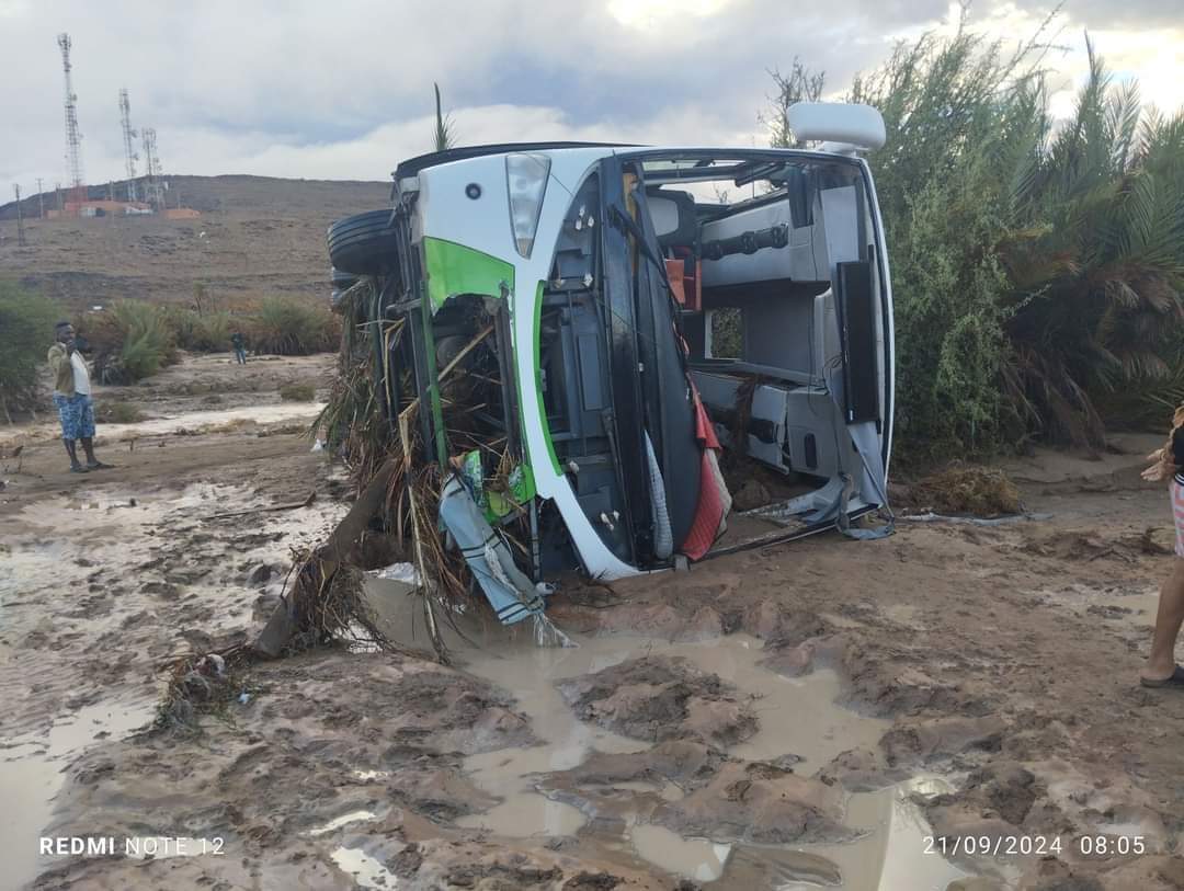 وأفاد بلاغ للسلطات المحلية (الداخلية) بإقليم طاطا أصدرته السبت 21 شتنبر 2024، عممته وكالة المغرب العربي للأنباء، بما أسماه الحصيلة الأولية، “إثر التساقطات الرعدية جد القوية التي شهدها الإقليم والتي أدت إلى إحداث تدفقات فيضاني استثنائية، تم أمس الجمعة، تسجيل حادثة انجراف حافلة للركاب بفعل السيول على مستوى واد طاطا”.