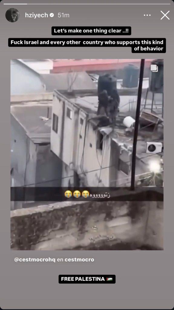 وفي التدوينة الأولى، نشر زياش صورة لعملية إعدام الشبان الفلسطينيين، وكتب “لنكن واضحين للغاية: تبا واللعنة على إسرائيل وكل بلد آخر يدعم هذا النوع من التصرفات”.