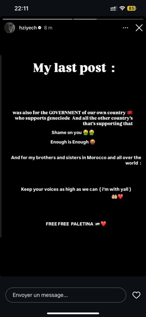 وأضاف في تدوينة ثانية، “آخر تدوينة أنشرها، ما قلته ينسحب على حكومة بلدي المغرب، ومن يدعم الإبادة، وجميع دول العالم الأخرى التي تدعم ما يجري، عار عليكم، كفى يعني كفى”.