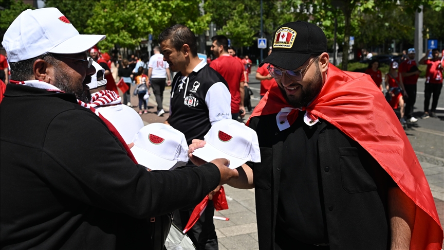 كما تم توزيع القبعات على المشجعين في مباراة تركيا والبرتغال في دورتموند. حيث قال وحيد الدين بيرام، أحد رواد الفعالية، إنهم أرادوا لفت انتباه الأوروبيين إلى الظلم في غزة. وأضاف أنهم تعاونوا مع رجال الأعمال لإنتاج القبعات، بدءاً بـ10 آلاف قبعة، وصولاً إلى 50 ألف قبعة. وأكد أن صورة البطيخ الأحمر ترمز إلى ألوان العلم الفلسطيني، وأنهم سيواصلون توزيع القبعات حتى نهاية بطولة أمم أوروبا.